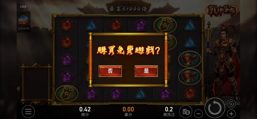 《戰神呂布》提供獨特的購買方式啟動免費遊戲模式,僅需支付當前投注籌碼的100倍即可立即進入。這特色將贈予您至少15次的獎勵遊戲機會,讓您在遊戲中有更多獲得高分的機會!趕快來體驗這讓人心跳加速的遊戲特色!