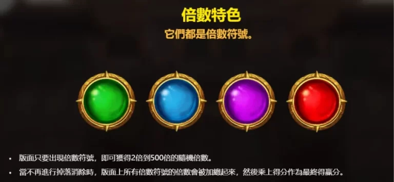 - ∙ 當無法再進行掉落消除時,版面上所有倍數符號的倍數將被加總,並乘上得分作為最終獎勵。